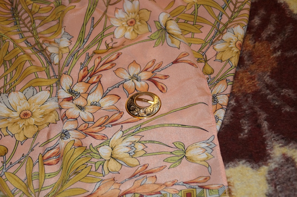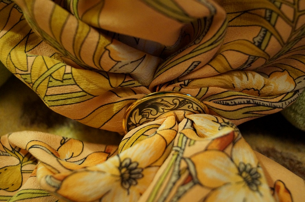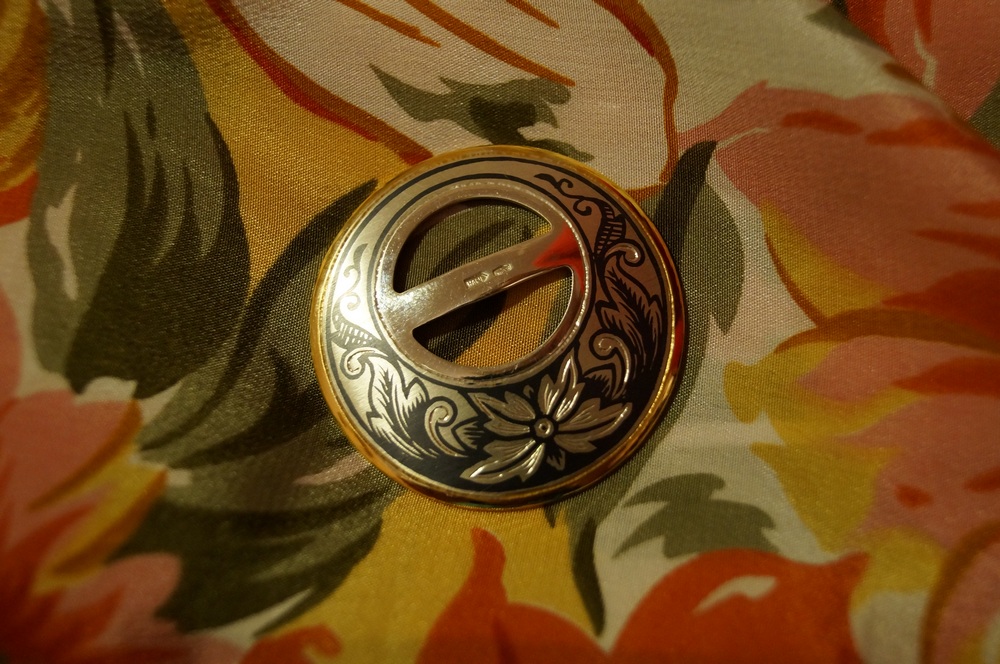Тамарочка ^% , еще раз спасибо за ссылку ЗАО "Северная чернь". Я уже приобрела прекрасные серебряные украшения этой компании. Вот, например, зажим для платка. Он прекрасно подходит для небольших шелковых платочков, что и демонстрирую. А еще я там купила серьги, кулончик, кольцо. Ношу всё это с удовольствием.
