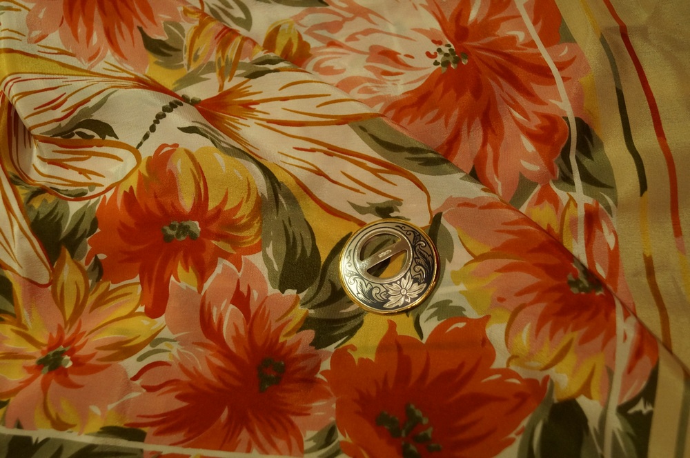 Тамарочка ^% , еще раз спасибо за ссылку ЗАО "Северная чернь". Я уже приобрела прекрасные серебряные украшения этой компании. Вот, например, зажим для платка. Он прекрасно подходит для небольших шелковых платочков, что и демонстрирую. А еще я там купила серьги, кулончик, кольцо. Ношу всё это с удовольствием.