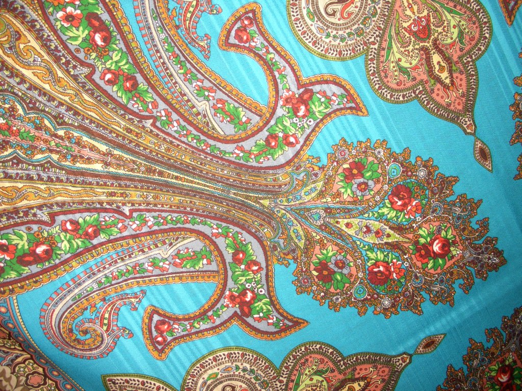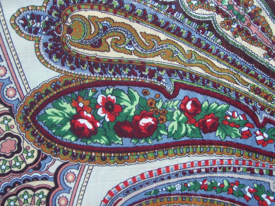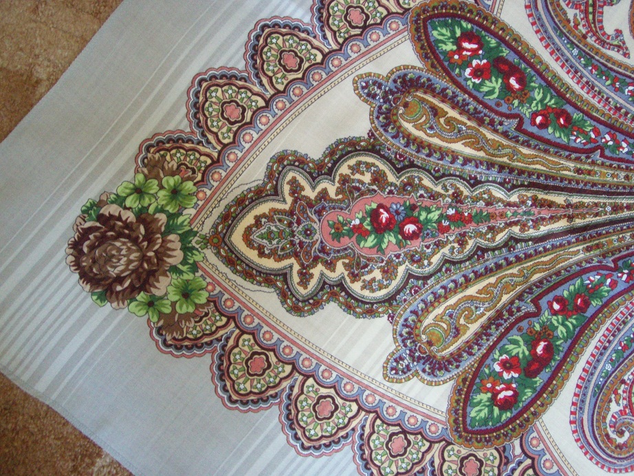 Цвет странный....и не серый (бледно-серый скорее всего...) по кайме, и не бежевый (молочно-сливочный..?) по центру. Но цвета в узоре - зелёный, бордово-малиновый ОЧЕНЬ яркие.