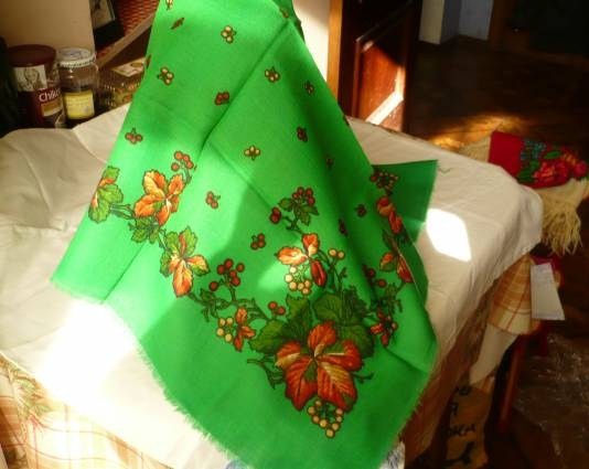 5. Боже, как меня злит искажение оттенков на фото :cry: Это - самая желанная "нагрузка". Самый ярко-изумрудный платок (чуть ярче изумрудной шали №1) с красивым тончайшим узором а-ля Восток. Но маленький, 72х72. Тонкая шерсть и странная шелковая бахрома-"тесьма", которую уже показывали на форуме. И платок чернопольный такой тоже показывали. В жизни приобретение выглядит куда эффектнее: