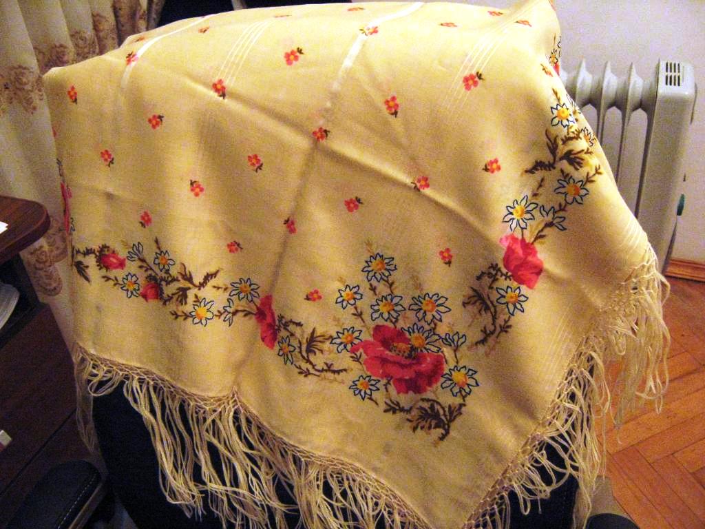 4. 98х98, шерстяной с шерстяными кистями, ткань плотнее чем у платков 95х95. Ну, со слов ему тоже лет 15. Был на форуме, и в этом колорите тоже был. Номер вроде бы не определен. Могу только заметить, что цвет поля на фотографиях у всех опять заметно поехал: платок не пошло-алый, а чууточку вишневее и темнее, очень приятный оттенок: