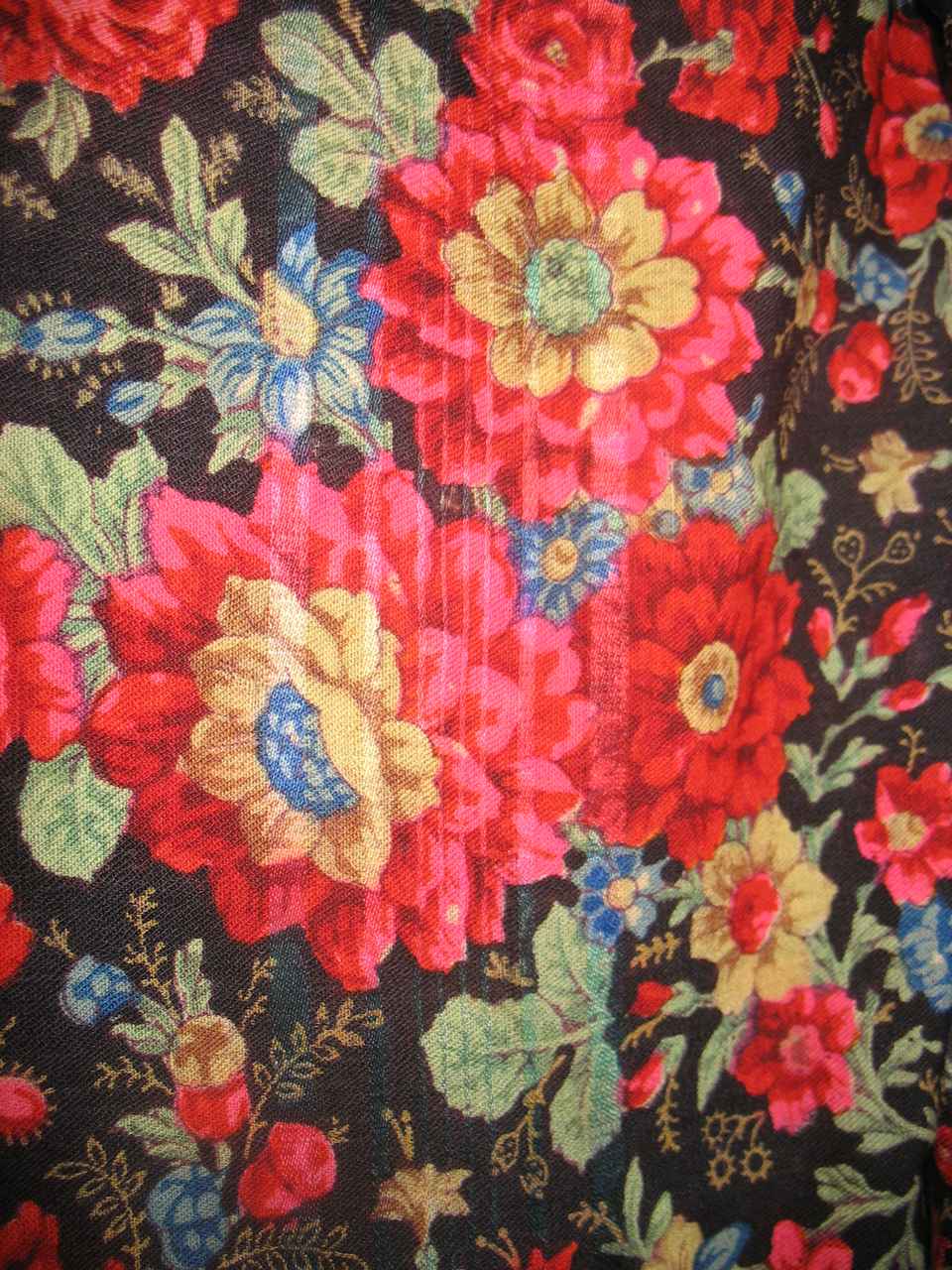 К сожалению никакой информации о названии и авторе этого платка нет, но абсолютно точно, что он павлово-посадский! Он покупался в приданое моей прабабушке Прасковье. Сложно сказать в каком точно году состоялась ее свадьба, но если судить по году рождения моей бабушка Агафьи - 1918 (а она была далеко не первым ребенком в большой деревенской семье) - то этому платку почти 100 лет!