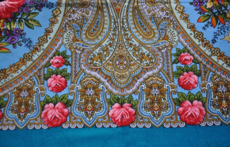 Снимала без вспышки, но день был пасмурный. Цвет уходит немного больше в бирюзовость. На самом деле кайма темно-бирюзовая, как серединка на Счастливице 30, а в медальонах - цвет небесно-голубой, не нашла с чем сравнить.