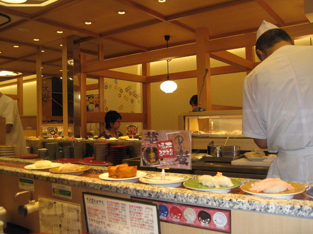 Кайтан-суши бар. Все блюда подают на транспортер,и ты выбираешь.Тарелочки разного цвета,это означает цену блюда. Прикольно!Весь мой праздник живота обошелся в 450 рублей.В Хабаровске так не покушаешь...