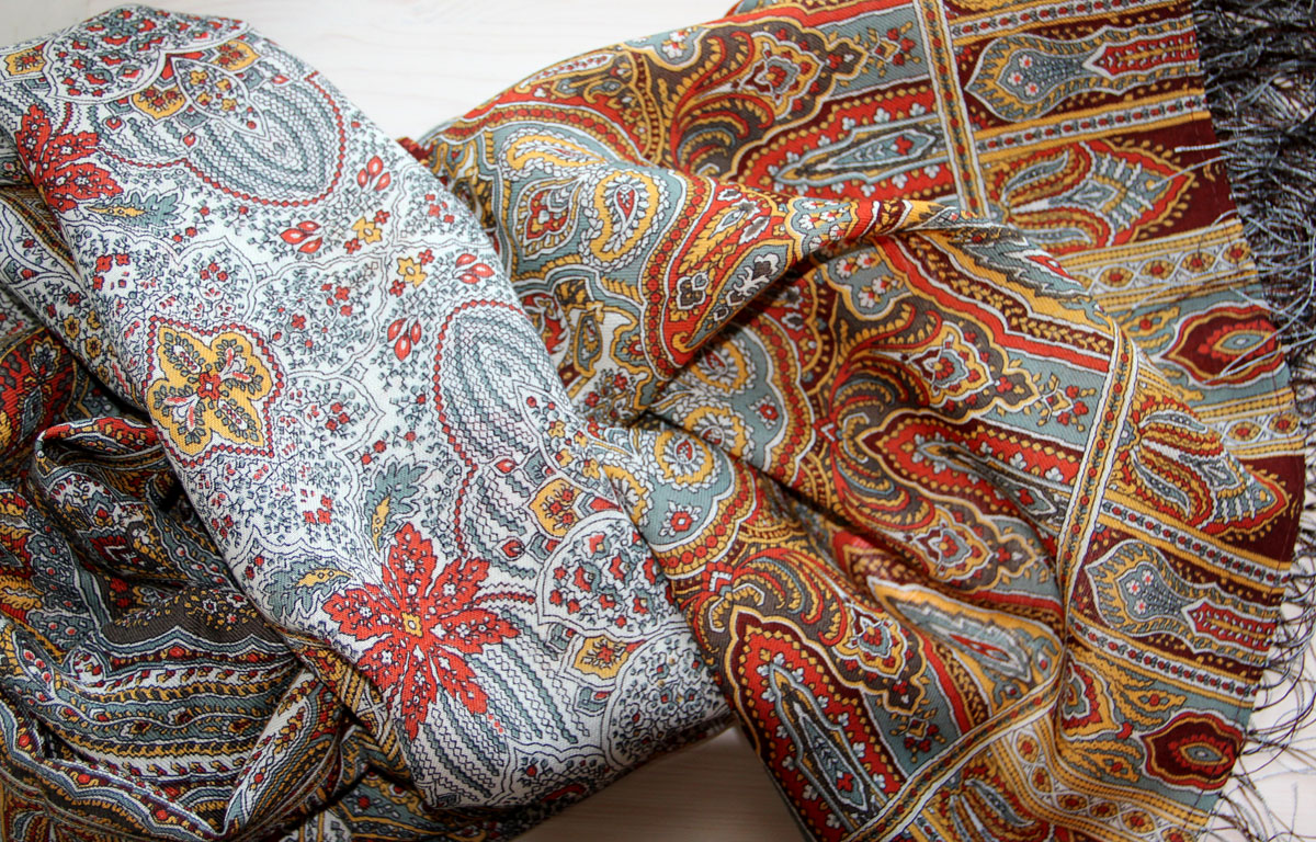 Есть платки просто предназначенные для того, чтоб лежать у лица, есть те, что хороши в дарапировке на шее, а есть те , которые не терпят никаких изломов , они должны быть наброшены на плечи и рисунок их, независимый и гордый, раскроется тогда в полную силу. Наверное, это "мужские" шали.