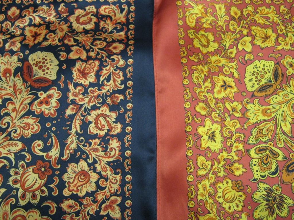 Действительно, колориты очень близки, особенно в драпировке. (Кликните, чтобы почитать оффтопик)... Но если рассматривать рисунки, то Майя, конечно же, более детально прорисована, композиционно сложнее. А Ностальгия, отвечает своему названию, монохромна, без ярких акцентов, спокойный, достойный платок.