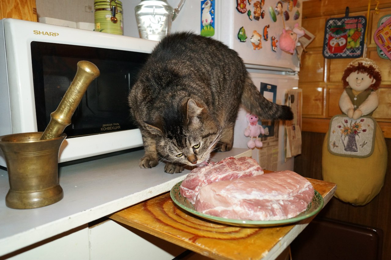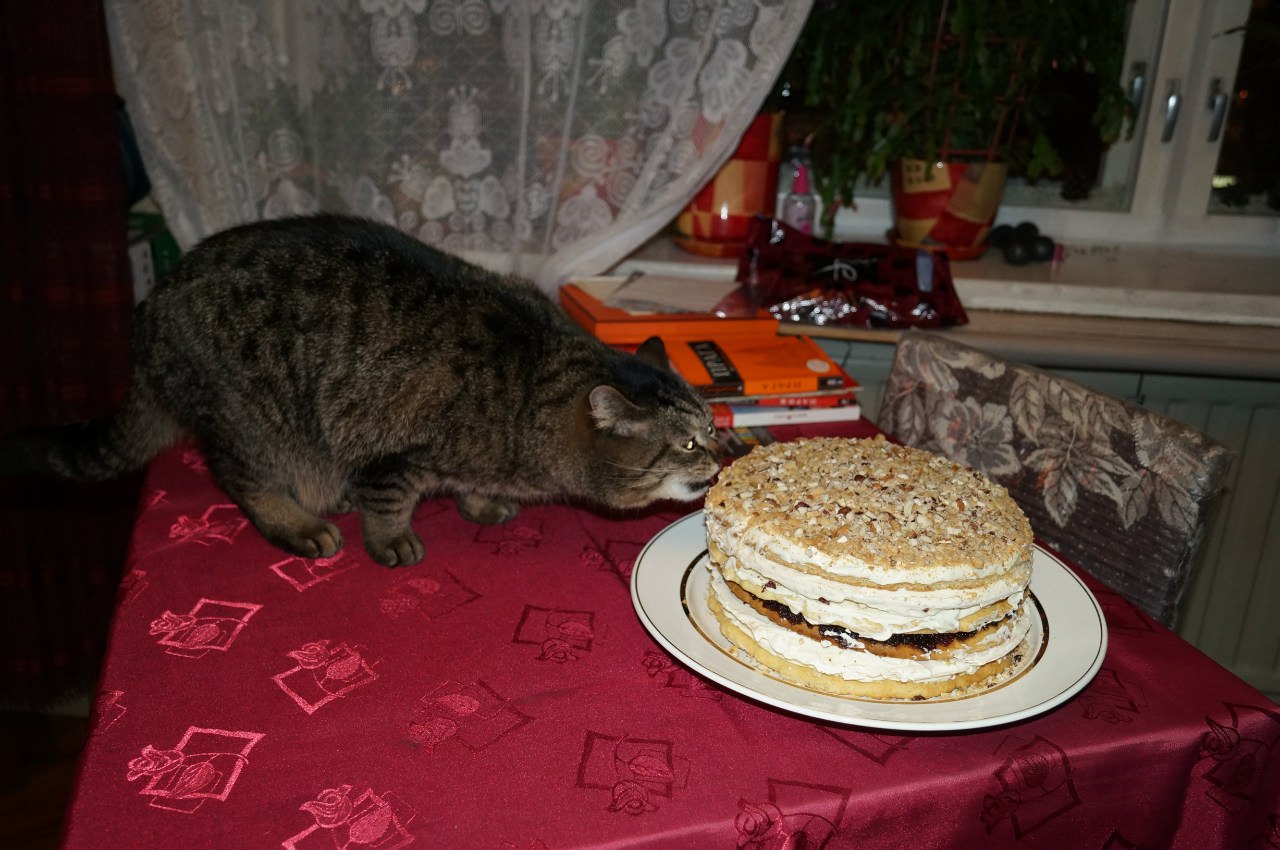 Именно! Маменька была наивна, решив, что торт можно оставить на столе. После поползновения торт переместили на лоджию. Но пришлось от кота откупаться мясом!
