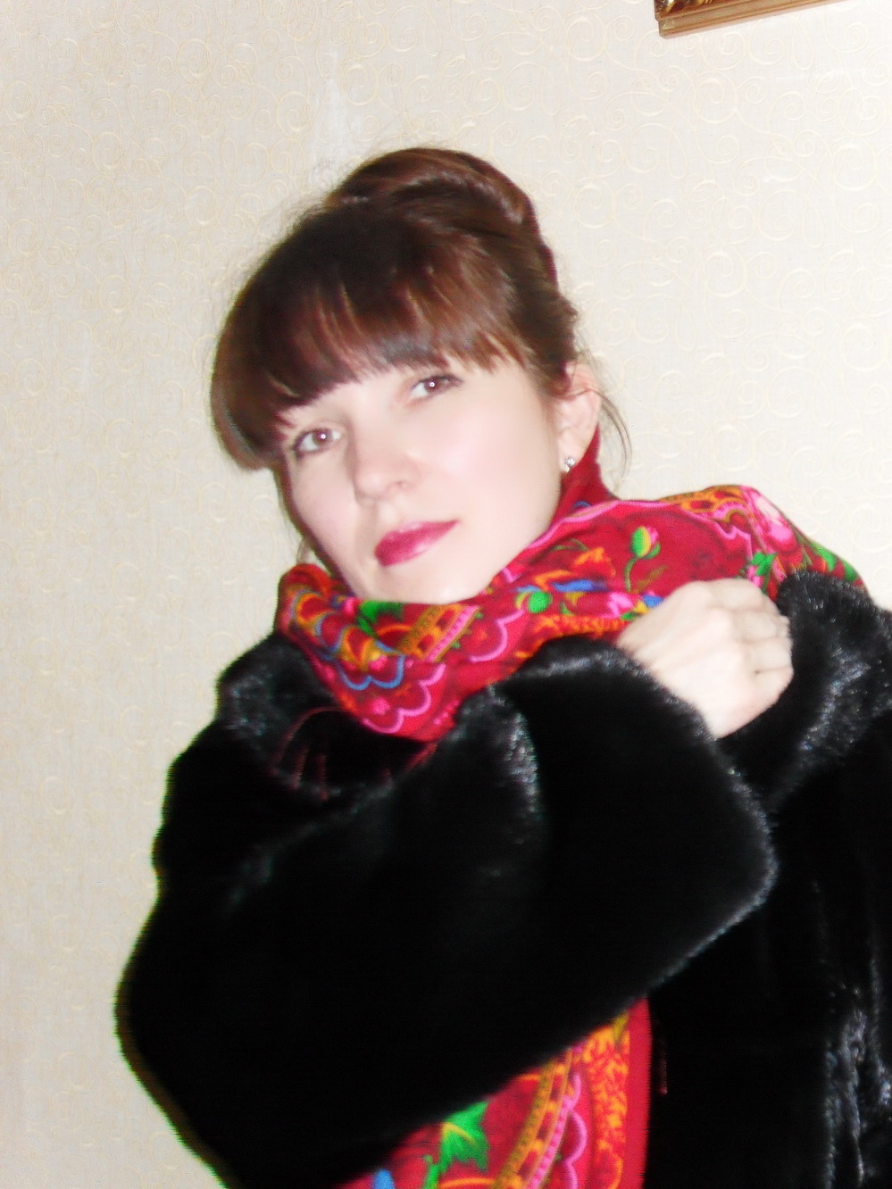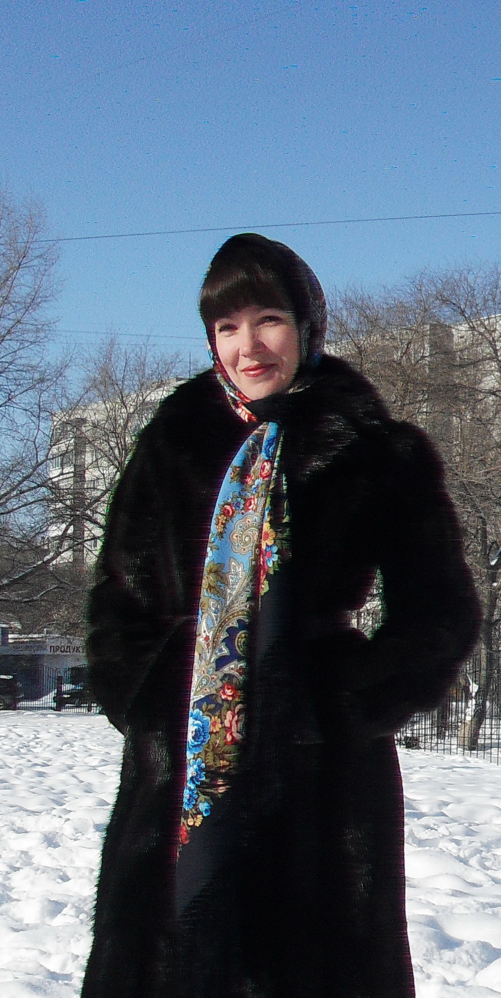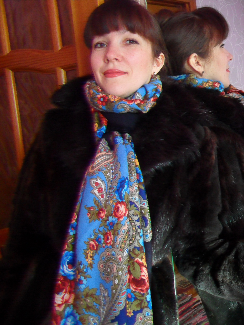 А дочурка - прелесть. Заметила, что молоденькие девушки чаще выбирают такие традиционные расцветки и так их повязывают. У меня дочка носит платочки 89х89, ей их удобнее наматывать вокруг шеи - меньше объем складок ("Незнакомка" черная близка по расцветке к сумеркам). А когда были морозы под 40, и старшеклассники ходили в школу на занятия, она брала у меня большую шаль и заворачивалась в нее в школе. Чем, говорит, сидеть в верхней одежде, так лучше в шали - тепло и легко.