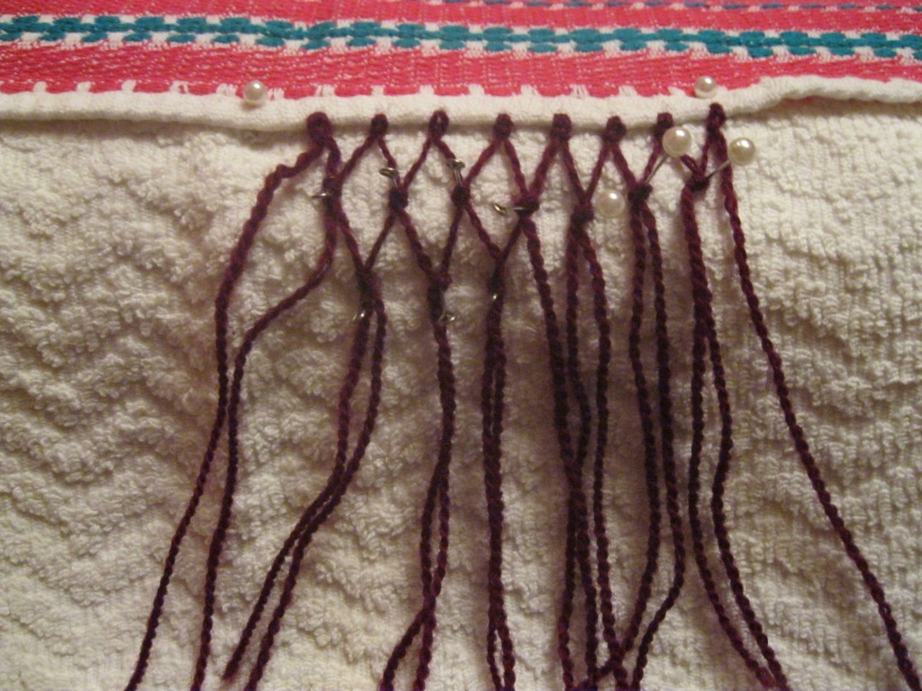 Никакие коклюшеподобные предметы мне не понадобились: бахрома оказалась довольно мелкой, затягивалась на глаз. Есть ряд нюансов, которые пришлось учитывать при плетении бахромы именно из толстой пряжи: во-первых, неплотно затянутые узелки, хотя и сохраняют полезное качество "самовыравнивания", но смотрятся некрасиво, как больной узловатый сустав на пальце. Пришлось тратить дополнительное время на утягивание узелков. Во-вторых, я очень кстати начала наплетать бахрому с изнанки: так она симпатичнее всего смотрится именно с лицевой стороны. В третьих, толстые и плотно скрученные кончики ведут себя просто бешено