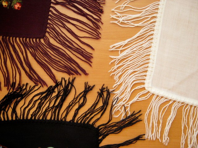 А "Гжель" (справа) и "Звонница" ждут переделки. "Гжель" я единственную из белопольных сохраню (пока) с бахромой (тоже под шерстяное пальто подходит - download/file.php?id=22891&mode=view). На этом платке бахрома старого образца, она немного другая.