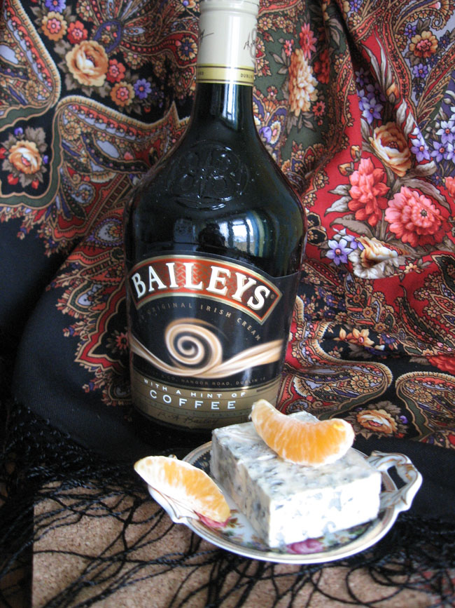 Бутылочка любимого Baileys, серебристый сыр, фрукты.