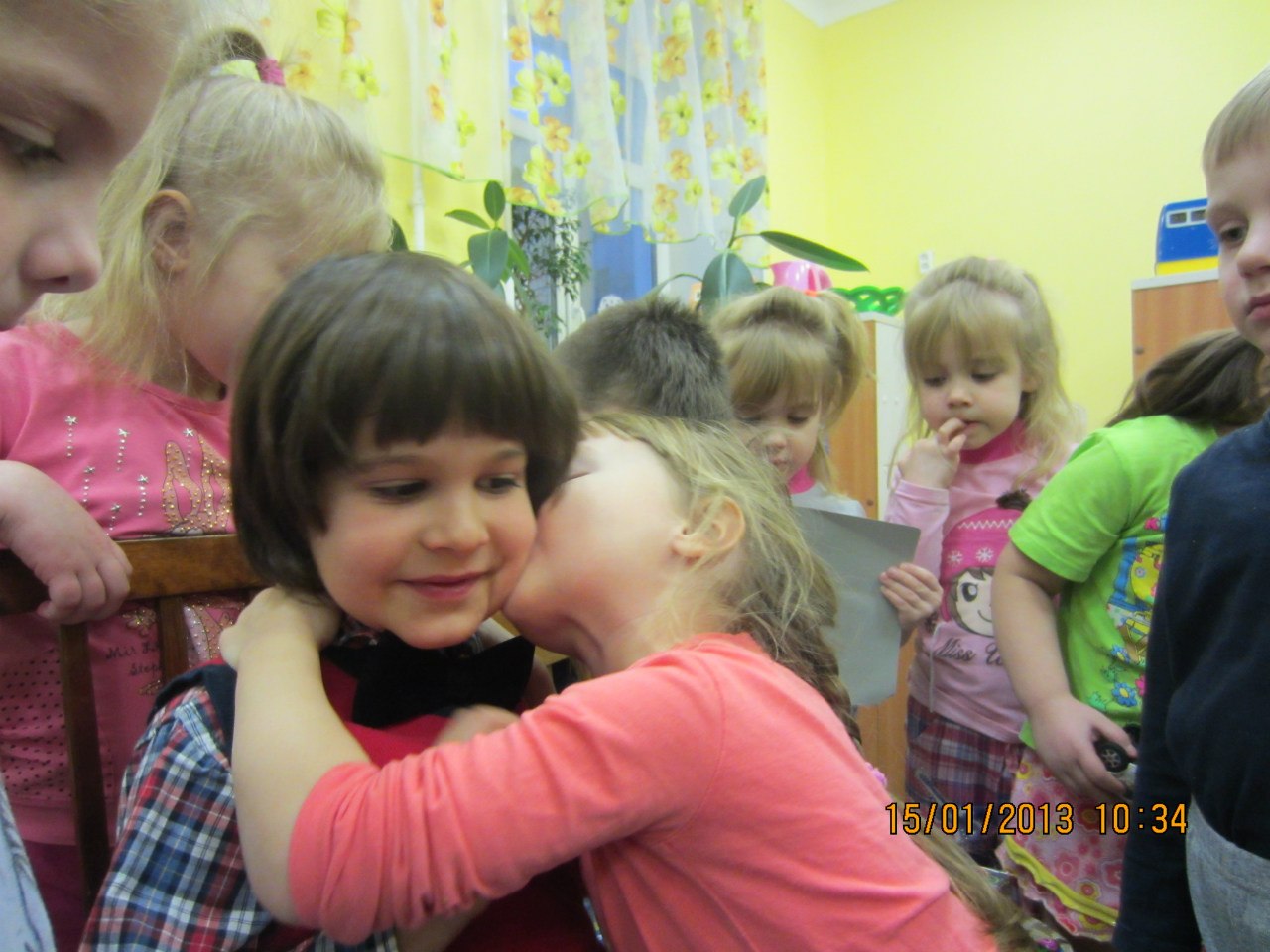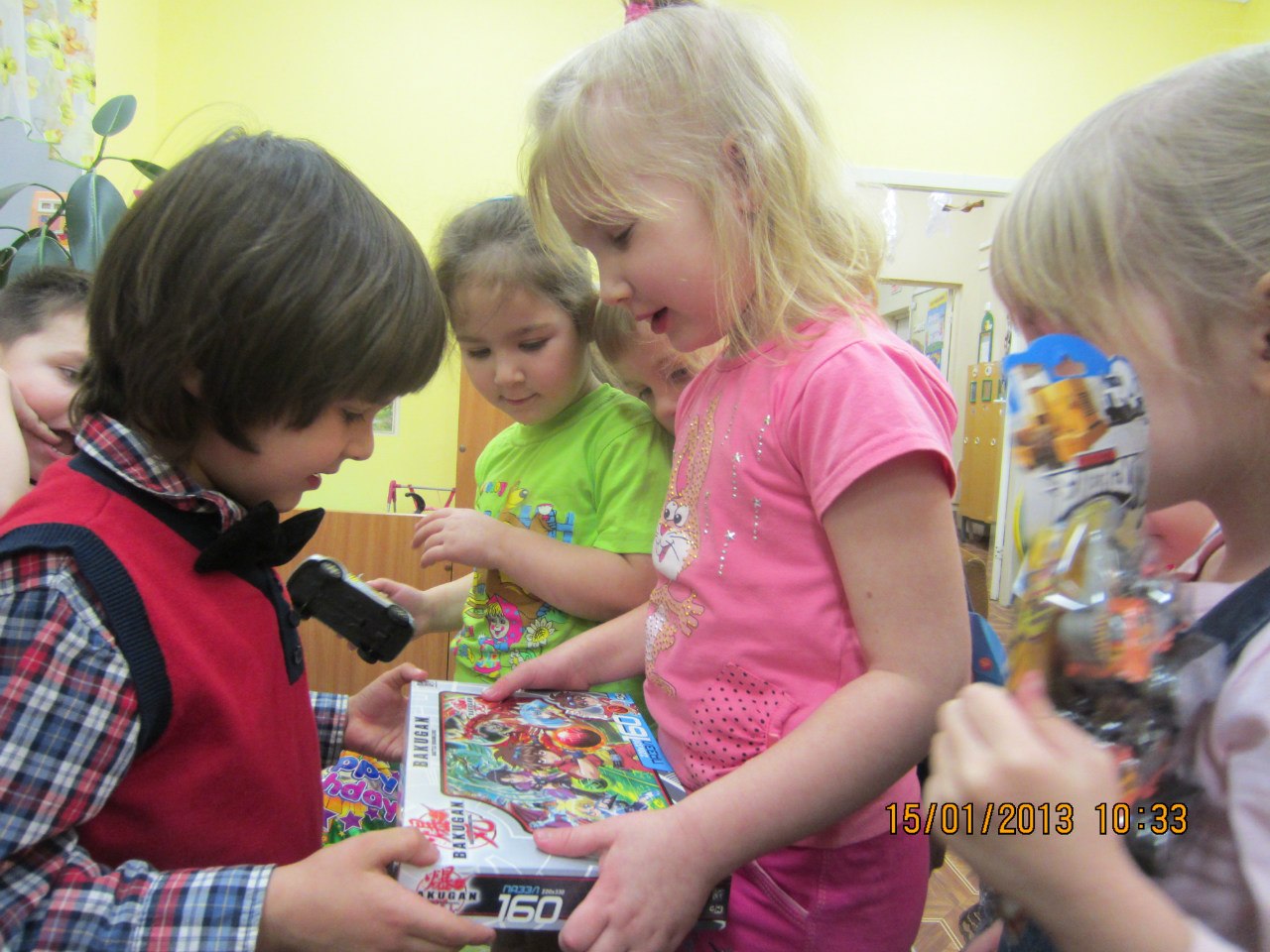 Неделю назад отмечали пропущенный по болезни ДР Егора. Традиционно каждое дите дарит имениннику (имениннице) небольшой подарок. Ну, и слова хорошие говорит...поздравительные)... Руку учат жать и в щечки целовать))). Потом хороводы водят,песни поют. Потом виновник торжества угощает всех.
