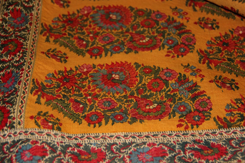 И ещё жёлтая кашмирская шаль - теперь это не квадрат, а прямоугольник. На ощупь шерсть очень колючая и плотная. Да ещё ткачество придаёт плотности в местах с орнаментом.