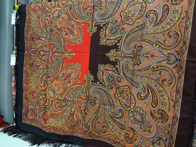 Теперь - некоторые детали и сравнения. Обращу ваше внимание на колорит 1402-07 (коричневый). Цвет каймы более всего похож на цвет каймы у платка "Ларец самоцветный" (слева направо - Ларец, Восточный калейдоскоп,Февраль, Испанский). При электрическом ненаправленном свете - тёмно-коричневый. При ярком эл.свете - к коричневому добавляется бордовый оттенок.