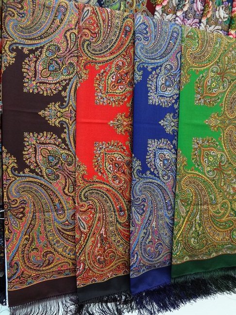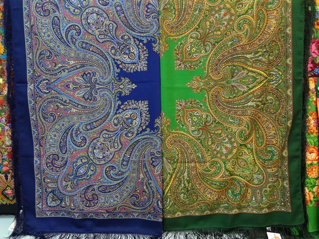 "Восточный калейдоскоп", 4 колорита : 1402-07 (коричневый), 1402-18 (красный), 1402 -14 (синий), 1402-10 (зелёный). Рассматривать их и правда, лучше не на фотографии, а в реальности. Самым интересным мне показался коричневый (можно сказать коричнево-бордовый...). Фотографии сделаны со вспышкой и без...электрический свет кое-где искажает цвет (в частности, синий на фото ярче, в реальности он глуше), но в целом - представление о платках по этим фото составить можно.