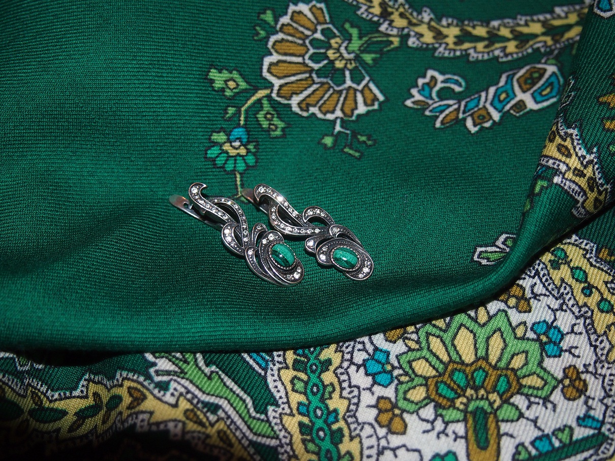Это малахит. Его не имеет смысла подделывать, такого размера он недорогой. Понравились эти серьги и с Морозко комплект. Очень подходят к шалям.