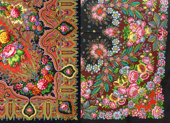 Сразу же вспомнился платок "Подмосковные вечера". А чёрный похож на старинный, который хранится в музее Сергиева Посада.