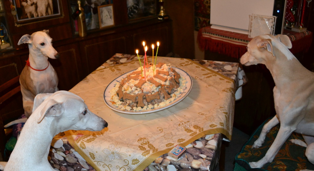 Сегодня двум моим сурикатам, то бишь уиппетам, исполнилось 5 лет. В честь праздника я им на ужин приготовила больш-о-о-о-ой тортик. Так как самое большое блюдо в доме - это от Кузнецова, то пришлось им воспользоваться
