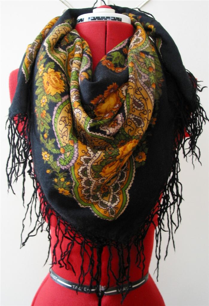 номер 2. Достался от бабушки, яркие флюоресцентные розовые и голубые цветы на черном фоне. Шерсть, размер 94х95, с одинаковым успехом мог быть куплен как на Украине, так и в Мск. В БС такого нет.