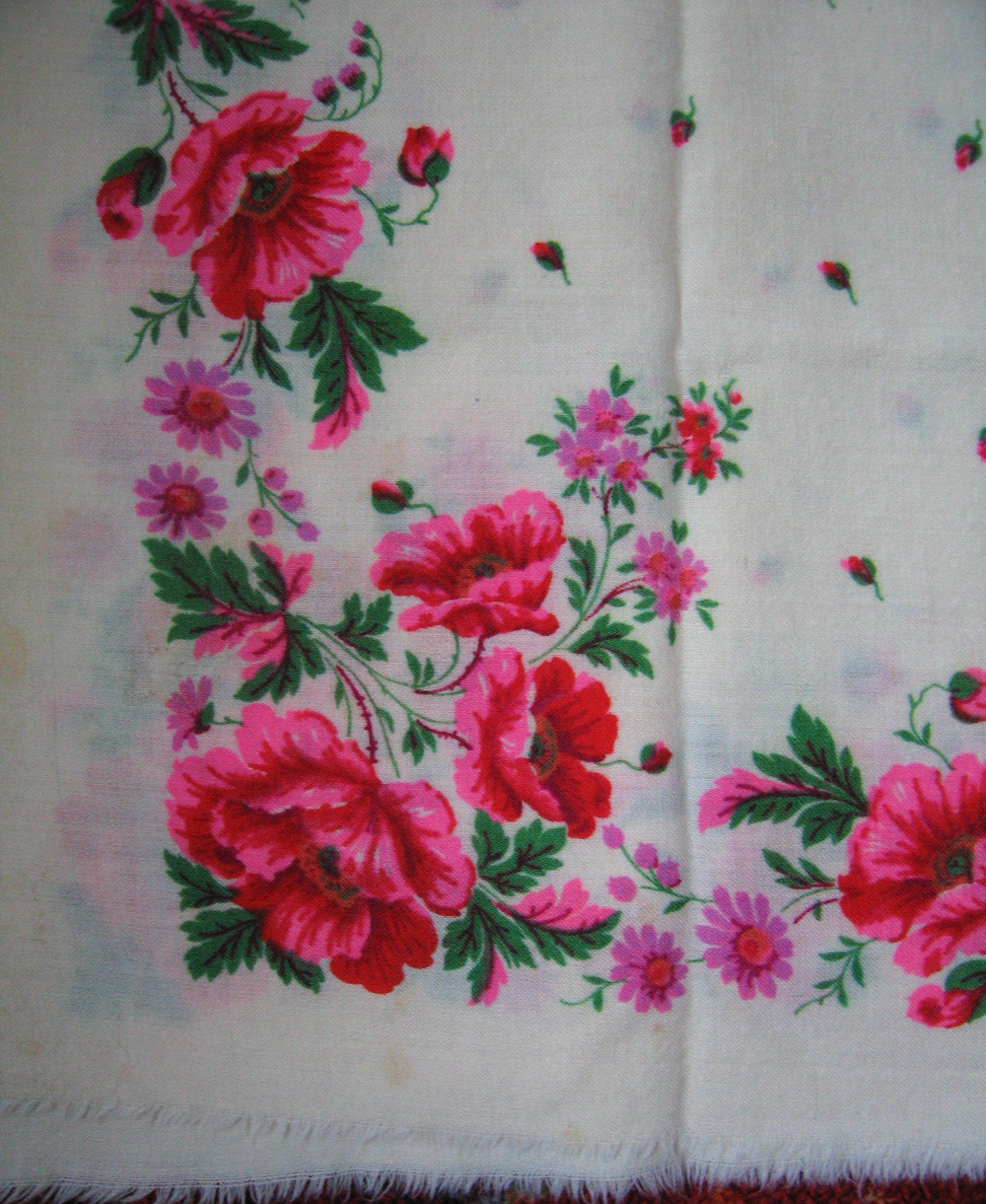 номер 3. Как и черный, достался от бабушки. Шерсть, примерно 90х92 см. Куплен, как и черный, то ли в Москве, то ли на Украине, в годах эдак 80х. Фон кремовый, розовый ооочень яркий. С таким же рисунком, но хлопковый и менее яркий, нашла на молотке. Продавец пишет, что ППосад.
