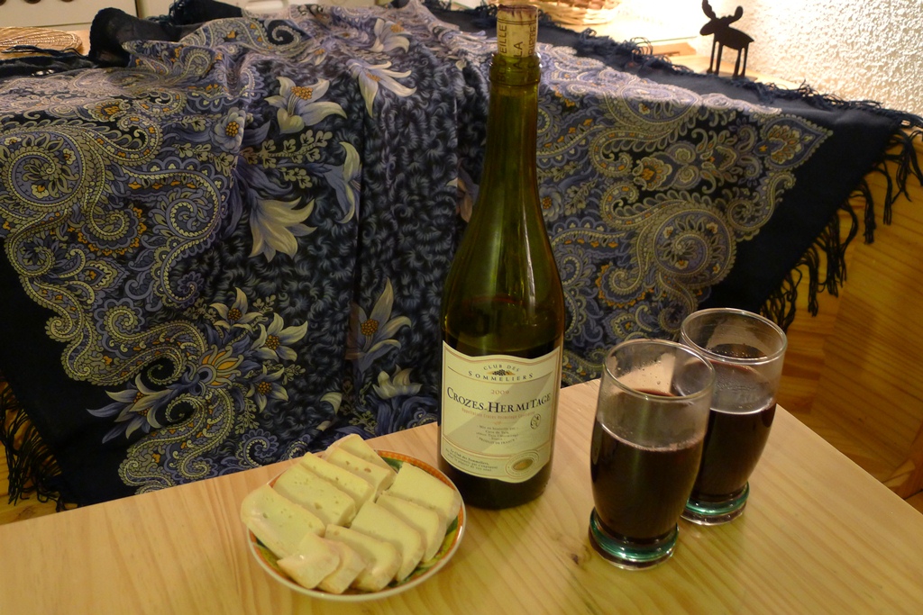 В этот раз было вино 2009 года, 8-9 евро за бутылку. Мы делали из него глинтвейн, хотя это, может, и не очень правильно – обычно для этого используется самое дешевое вино. Намерзшись за день, с одного бокала горячего ароматного напитка отрубались сразу, зато утром – ни в одном глазу, свежие как огурцы. Рецептов великое множество, наш – добавить в вино нарезанные лимон, апельсин, яблоко, корицу, гвоздику, коричневый сахар и подогреть, но не до кипения. К глинтвейну хорошо пошли сыры – нормандский камамбер, куломье, савойский реблошон.