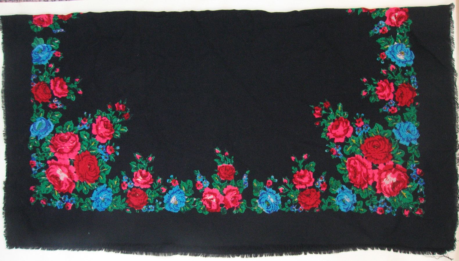 Номер два. Чернопольный платок 89х105, со странной печатью; сомневаюсь, что это ПП, уж очень нетипичным, "рваным" выглядит рисунок, но мало ли. Предыдущий, этот и следующие несколько платков достались от бабушки, им всем минимум 20 лет. Платку не очень повезло, его здорово потрепала моль, но меня чем-то привлекает небрежность узора, поэтому занимаюсь его восстановлением (попросту штопаю). Штопаные места маскирую вышивкой а-ля гладь (учитывая повреждения, хуже ему уже не стать, а так будет носибельным).