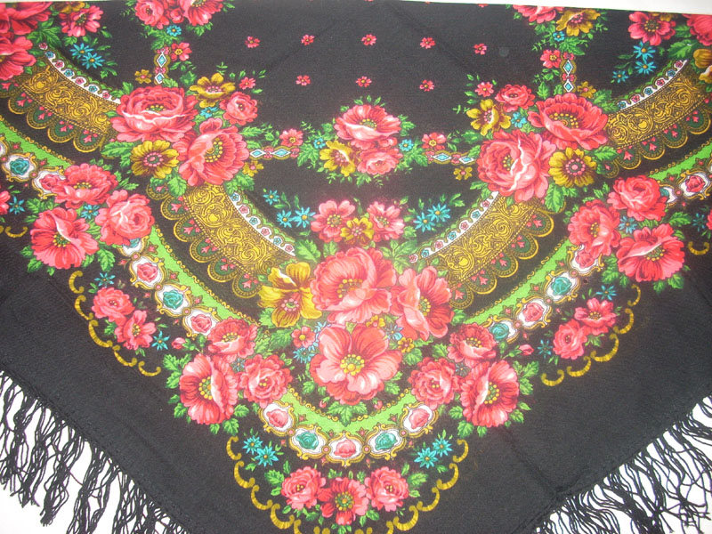 Хочу показать наконец полученный платочек. Можно сказать он очень традиционный, только розочки (маки т.е.) не розовые, а алые. Красивого алого цвета.