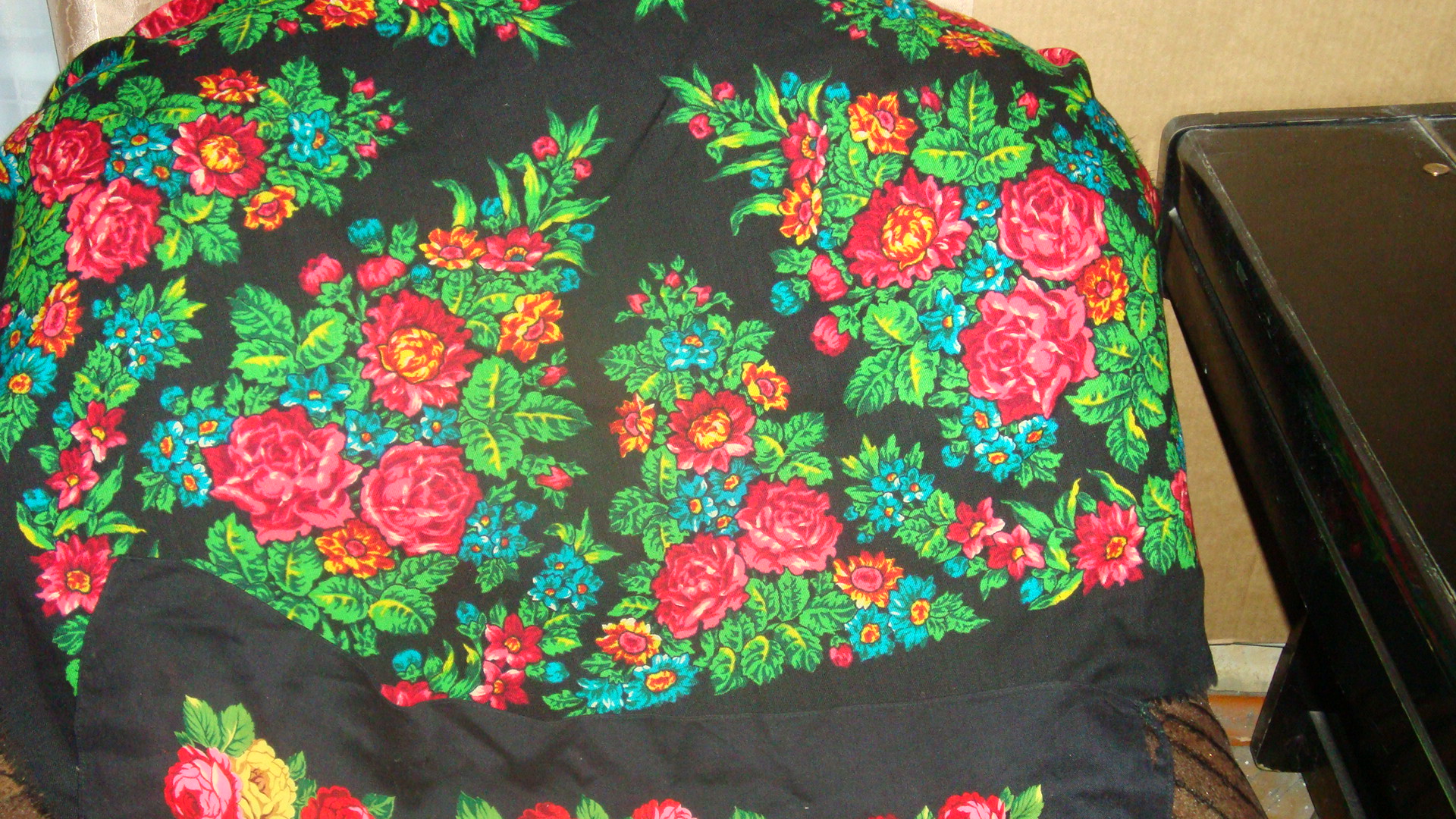 А второй и третий практически не носились, лежали у бабушки в загашнике. Они абсолютно идентичные только один на черном фоне, другой - на белом. Очень яркие краски,особенно зеленый и розовый. Носила черный на шею под полушубок, видно было чуть-чуть,но и то казалось вызывающе ярко.Размер 89*89 неподшит .И что интересно с 3 сторон есть черные полосы, а с четвертой практически нет - сразу рисунок. Может,брак? ><