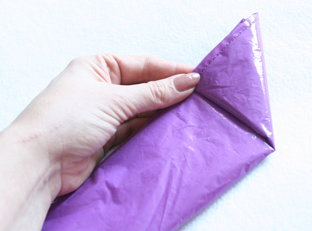 Теперь начинаем складывать снизу, от дна пакета. Берем уголок и сворачиваем его – получился маленький треугольник. Этот треугольник заворачиваем вверх, снова получился треугольник. Сворачиваем так пакет до конца.