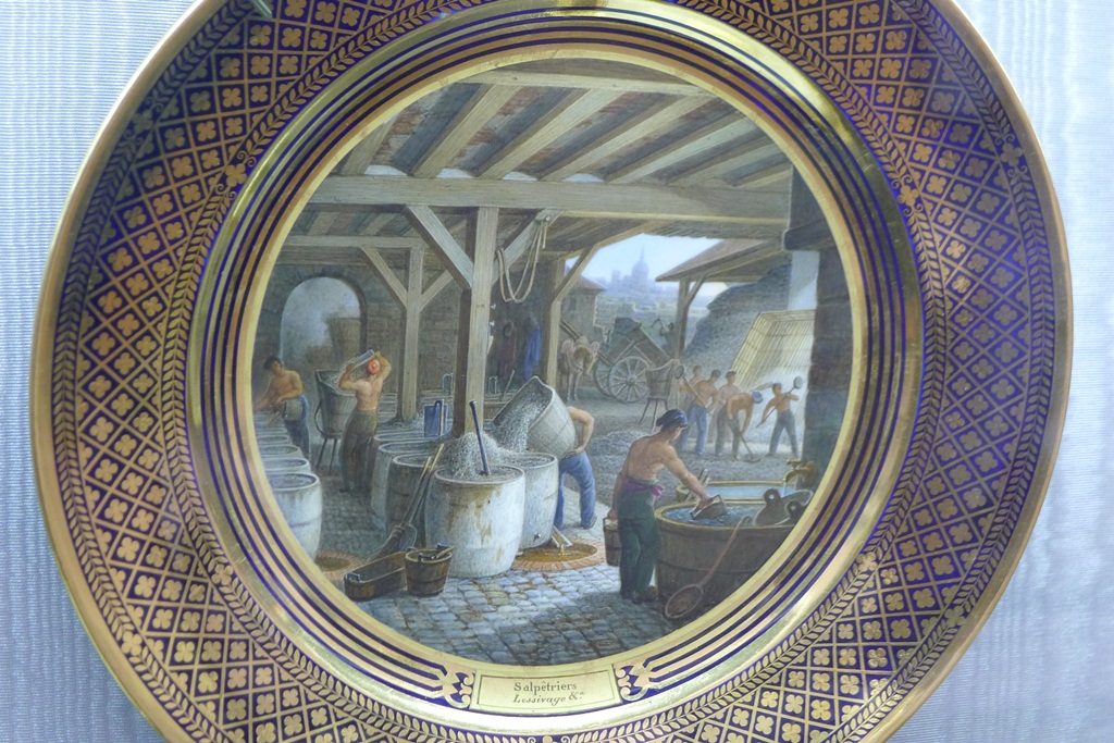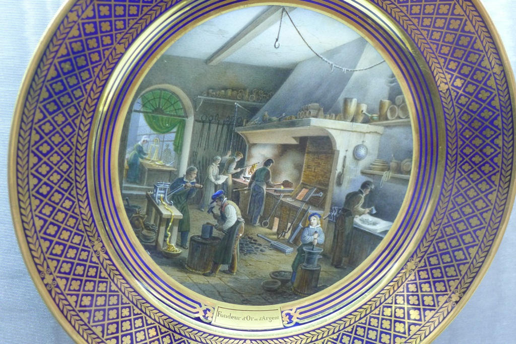 Ну и, само собой, увековечили в фарфоре родное предприятие. На тарелках - Севрская фарфоровая мануфактура, обжиг в муфельных печах, на 2-м фото - глазурование и еще какой-то процесс, перевести не удалось.