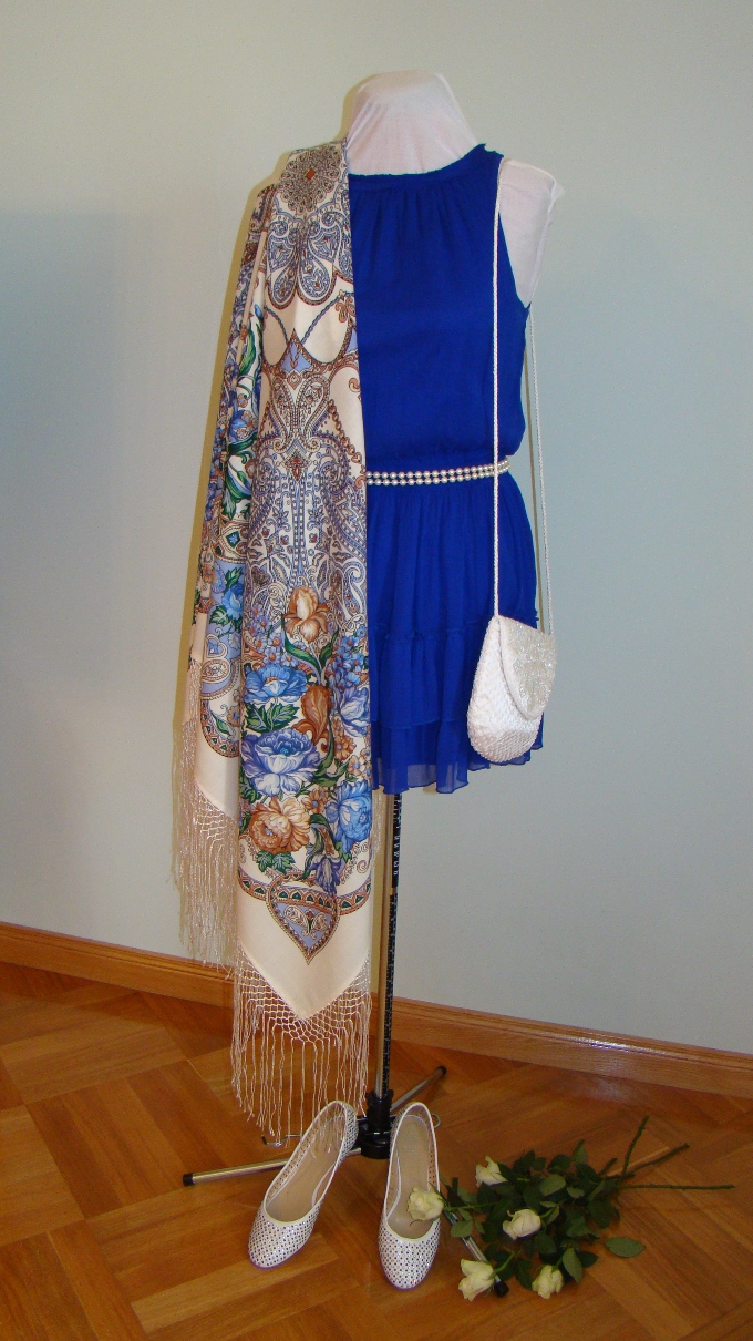Нежданный белопольный Княжеский вызвал неожиданную реакцию – кому-то показался недокрашенным, кому-то – слишком простым, а меня неожиданно очаровал. При безумной любви к разноцветным шалям, очень не хватало чего-то более спокойного, почти монохромного, сдержанно-нежного. А при личной встрече оказался он достаточно ярким, но очень изящным, изысканным, но чуточку капризным … «трепетным» назвала его моя приятельница. Сразу представился в элегантном комплекте с классическими костюмами из шерсти, васильковой или «цвета слоновой кости» ; с велюровым белым пальто и непременно синими перчатками (как у Ванессы); или с легким платьем из голубого кружева или шитья, и чтобы юбка «летящая»; или со светлым платьем в пол в «ампирном» стиле; а ещё с бесподобными вязаными юбками и платьями ( как у Брусники и других наших рукодельниц)…