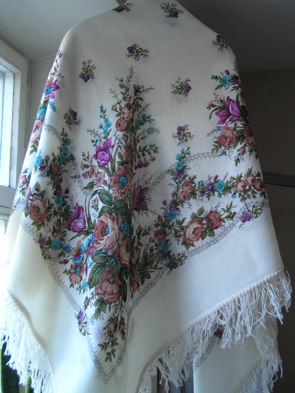 Синяя Птица!Какая шикарная красочная шаль. Где же вы ее достали? U^U Хотелось бы увидеть ее на Вас в Примерочной. Белые шали,на мой взгляд, подбирать сложнее, чем черные.Они обязывают.