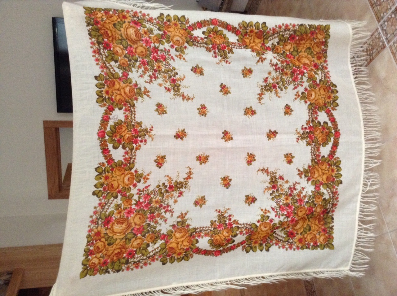 Дорогие форумчанки, есть вот такой платок 146х146 или даже 150х150, с шерстяной бахромой, клеймо мануфактуры, 1991 год. Фон более сливочный чем на фото. Как бы понять, что за платок. По розочкам на Ирину Дадонову похоже вроде бы.