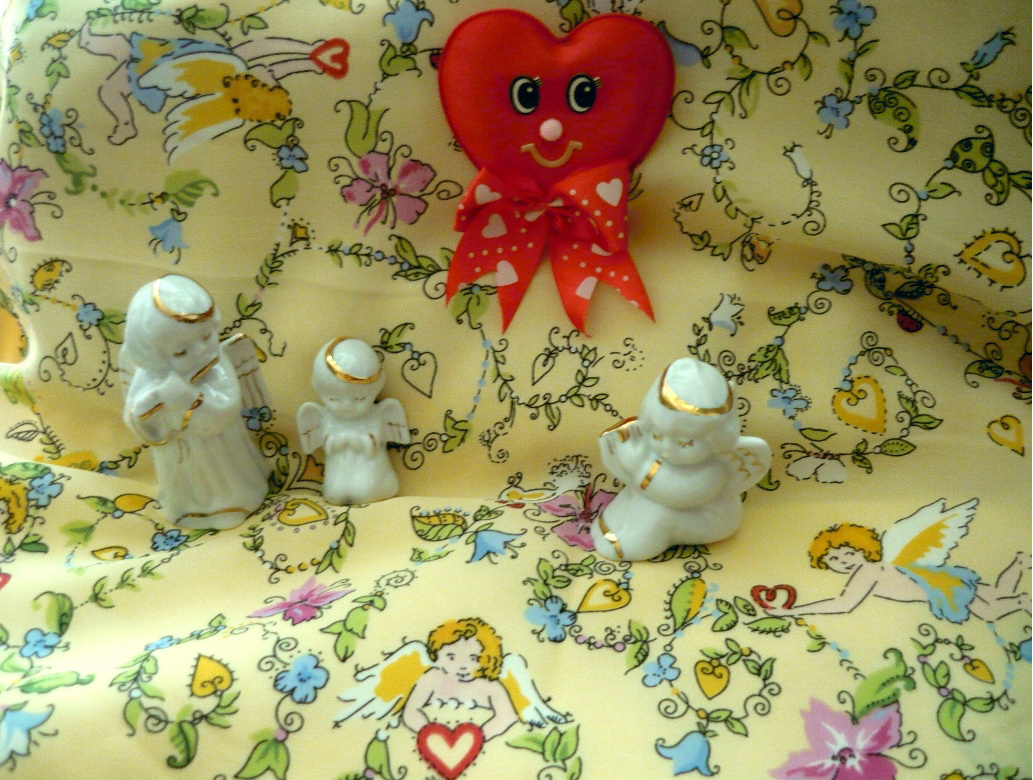 Заказала для внучки премиленький платочек "Купидоны" и композицию составила с фарфоровыми ангелочками.