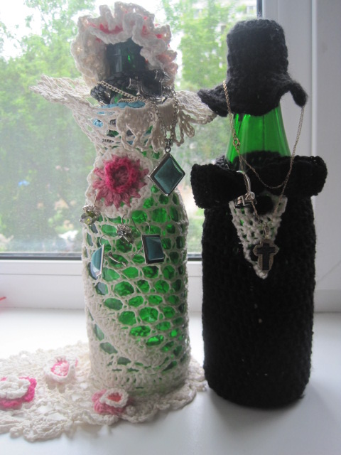 Я не знаю,как у вас,но у меня бижутерия вечно теряется.И в шкатулках,и в футлярах,и коробочках-все как-то не на месте.Связала я чехол на бутылки,и развесила на них свои бранзулетки.И вроде ничего искать не нужно.Можно бутылку обтянуть старым чулком в сеточку-и будет удобно хранить мелкие вещички!