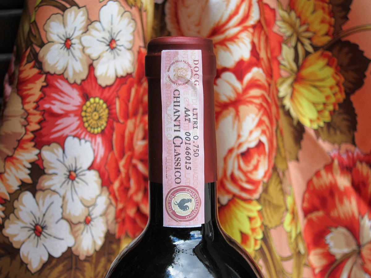 Обратите внимание на марку на горлышке. Черный петух в красном круге, галло неро. Это метка для Кьянти Классико (минимум 80 % Санджовезе, 12 % алкоголя и не меньше 7 месяцев в дубе) и Кьянти Ризерва (12.5 % алкоголя, минимум 21 месяц в дубе и 3 - в бутылке), которые, как правило, выше классом, чем простое кьянти. Цена, увы, тоже выше.