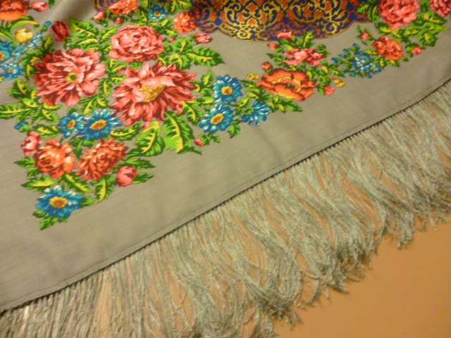 Что-то намоткой этот платок у меня не выходит. Там довольно крупные цветы и узор в стиле модерн. В намотке все пропадает.А Чеканковская бахрома получается довольно тяжелой. Вчера видела в магазине Мадонну с бахромой. Такая, как у всех просновочных. Простая.