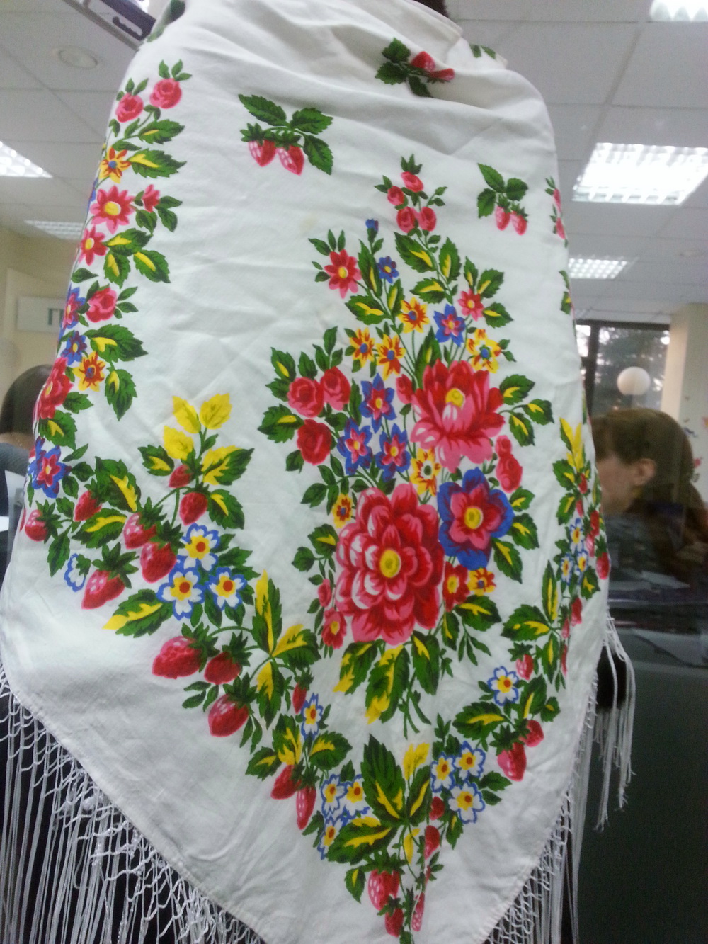 Помогите, пожалуйста, опознать платок. История следующая: у подруги коллега пришла сегодня в павловопосадской хлопковой шали, которая ей досталась от бабули. Размер полотна большой, ориентировочно 150*150.