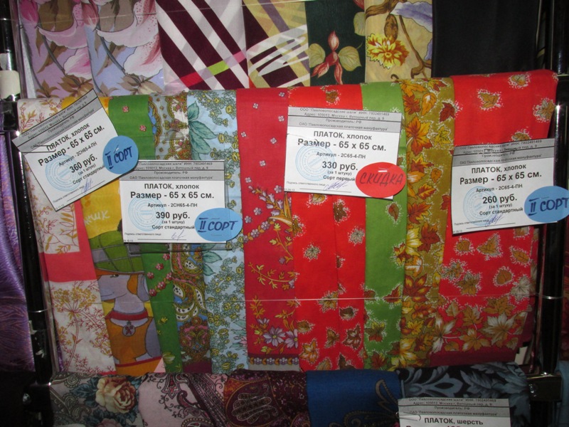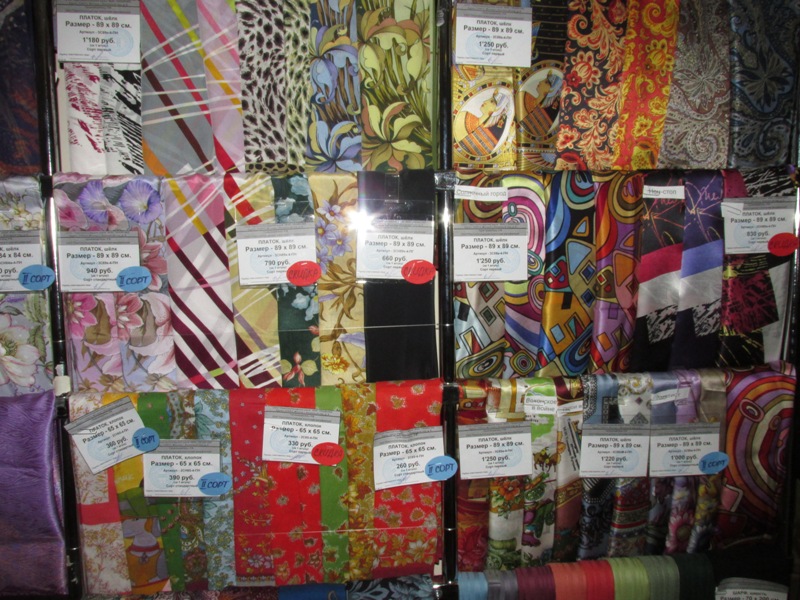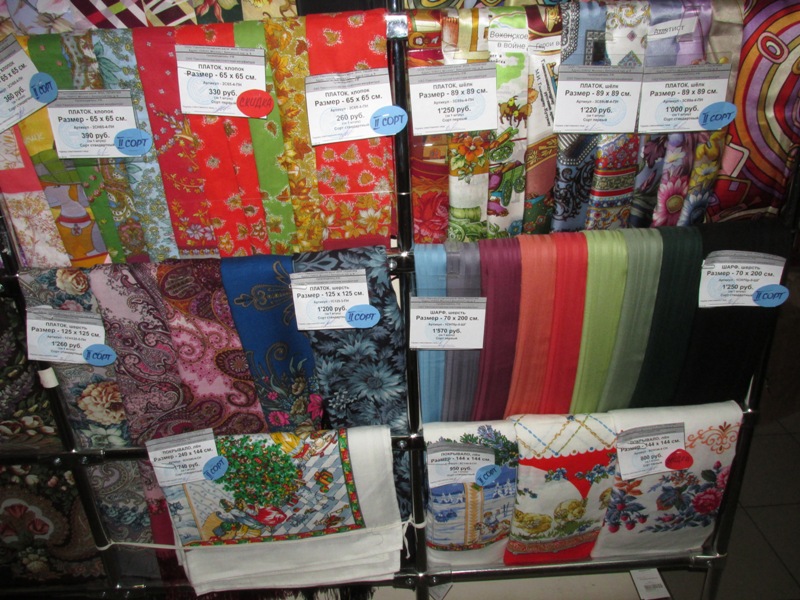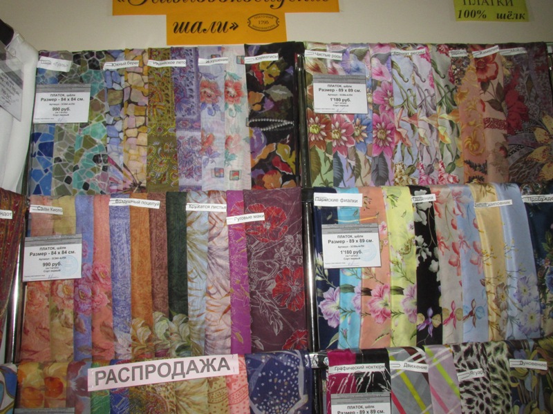Сегодня была в магазине в Ветошном переулке. К сожалению, не оказалось тех платков, за которыми пришла. Их ("Старый замок" и "Аромат любви") я видела в Выхино. Подумала, что здесь к открытию будут ТОЧНО...но - НЕТ. Цены - что в Выхино, что в Ветошном - не запредельные, но и не минимальные - однако СОВЕРШЕННО ОДИНАКОВЫЕ на все виды продукции ( подумала, что аренда в центре Москвы будет стоить дороже, и цены будут тоже выше, но - не выше). На мой взгляд, дороги шёлковые платки шёлк-атлас. Слишком. Порадовал большой выбор "уплотнёнки". И в том, и в другом магазинах - вежливые, внимательные продавцы. Плохо только то (ОЧЕНЬ ПЛОХО!!!), что в магазинах нет ТЕЛЕФОНОВ... Это надо в ближайшее время исправить!!! ^! И ещё меня в совершенном недоумении оставило то, что НЕТ НИКАКОЙ НАРУЖНОЙ РЕКЛАМЫ - ни в Выхино, ни в Ветошном. Сейчас уже никто ТАК не работает - срочно надо что-то предпринимать - указатели у метро, вывески при подходе (и В Торговых центрах) к павильону, в конце концов раздача листовок у метро, а если в центре ещё заинтересовать экскурсоводов...Конечно, те, кто отслеживает открывающиеся магазины - знают, понимают и посещают...А как быть тем - кто "проходил случайно"? (может быть, случайный прохожий пришёл бы в восторг от товара и купил бы не один платок, но ОТКУДА ему узнать, что в дорогом торговом центре на 0 этаже есть очень приятный магазин???...). А продукция ДОСТОЙНА ТОГО, чтобы ею интересовались, знали и любили многие и многие!!!