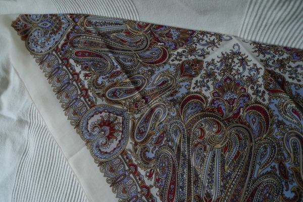 Итого - практически идеал. Да еще рисунки и колорит! Розы-цветы мне не идут, неоднократно проверено под придирчивым взглядом подруг и собственным придирчивым взглядом в зеркало, а вот такие узоры, более "европейские", мои. Ну и цветовая гамма бело-голубых "Гуляний" идеальна для цветотипа "Лето". Черные, как ни странно, тоже идут, хотя их надо более тщательно повязывать. В общем, я рада. И причем размер не настолько маленький, чтобы под подбородком оставался только краешек платка, нет. Не маленький - и не большой.
