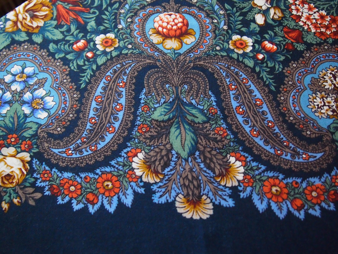 Alenuska, Branchette, Marfa, Viktorinka, спасибо, что разделяете мою радость. Я совершенно равнодушна к Бархатным и согласна с обсуждением в соседней теме, что его нужно рассматривать и любоваться вблизи. Видела много раз в метро на голове, действительно, не смотрится. А этот и на голове и по плечам пустить- красота. У платка такой удивительный цвет грунта, сейчас такого цвета и не отыщешь сразу, даже не знаю с чем сравнить, может только Сирень или Посадский. На фото вышло немного ярче...