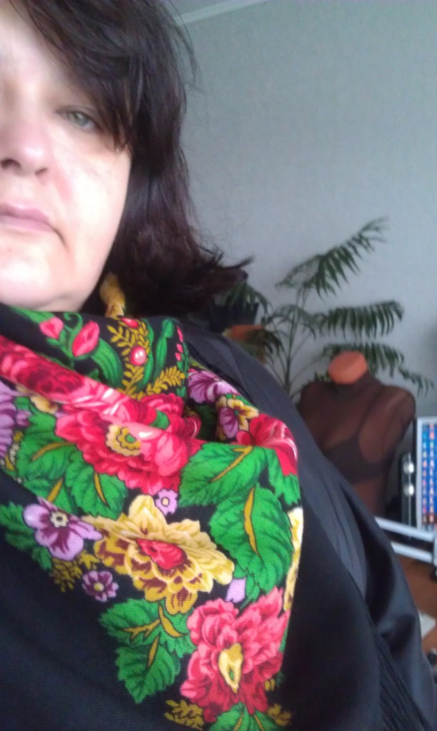 Так ведь как намотать... Святочный по-разному выглядит. Сначала очень сильно мешала широкая черная кайма - она о-о-очень широкая была, при намотке весь рисунок прятался, оставалась только эта рамка. Я кайму уменьшила, стало лучше. Когда "слюнявчиком" повязываю, то почему-то сиреневый цветок вылезает, а я хочу красные розы к лицу, поэтому не просто "завязала и пошла", а стараюсь правильно его завернуть, что требует дополнительного времени и усилий.