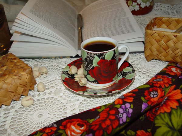 Вот такой пример простой кофейной чашечки и платка Русский сувенир, мне показалось, что-то есть в них общее.