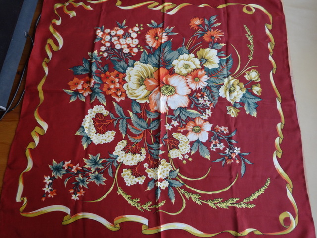 Хочу показать 2 шелковых платочка, купленных мною на подарки родным. Пестрая лента бордовая куплена для тети мужа - брюнеточки. Она носит красное и бордо.