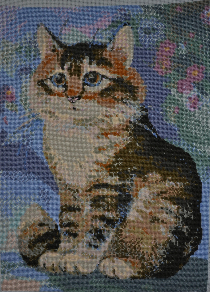 Наконец-то свершилось, мой котик завершён. Во время работы я называла его Гусаром, он мне очень напомнил Никиного красавца. Кота вышивала шерстяными нитками, фон - мулине.