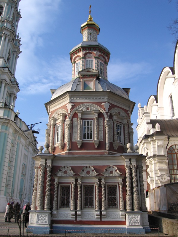 На 1-м фото на заднем плане - Церковь преподобного Сергия с Трапезной палатой (Трапезная церковь) (1686 – 1692), расположенная в южной части Лавры (к сожалению, в этот раз Трапезная церковь была в строительных лесах, что не позволило увидеть ее во всем великолепии). Трапезная церковь была сооружена по повелению царей Иоанна и Петра Алексеевичей в 1686–1692 гг. Трапезная палата, площадью более 500 кв. м, являющаяся одним из самых больших помещений своего времени, перекрытых сводом без промежуточных опор, предназначалась для торжественных приемов и праздничных трапез. В середине XX в. здесь проходили заседания Поместных и Архиерейских соборов Русской Православной Церкви.