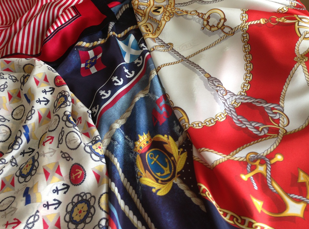 Мануфактура выпускает платки с абстрактным рисунком, такие как Движение, Графический ноктюрн, и другие, и, судя по всему, они пользуются спросом. Я ни в коем случае не хочу сказать об этих рисунках ничего плохого, но всё - таки об этих рисунках особо не поговоришь. А платки с якорями и прочей морской атрибутикой будет интересно разглядывать и делиться впечатлениями.