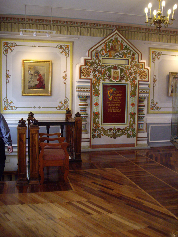 Интерьеры расписаны в стиле гуслицких старообрядческих рукописных орнаментов.