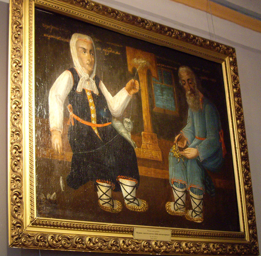 Полная гармония. Мужик плетет лапти, баба - нитки прядет. У кота интересная мимика.