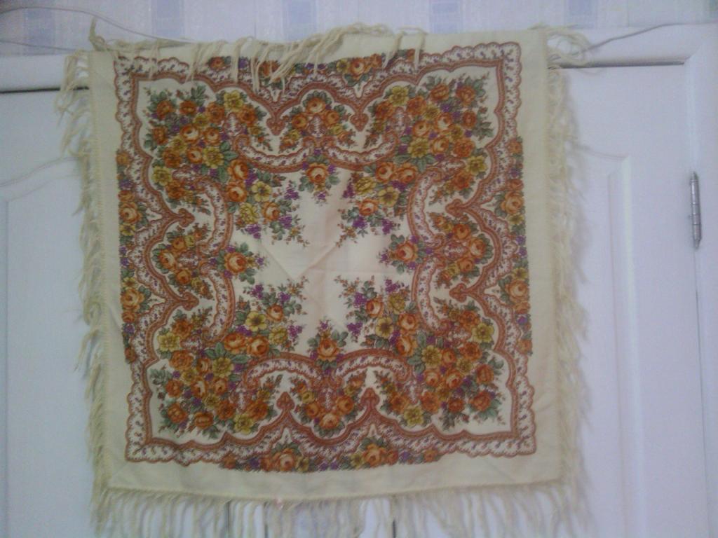 У меня есть два таких же платка. Первый подарен, второй по наследству от прабабушки достался. Первый он более кремовый, а второй у меня не с синенькими, а фиолетовыми цветочками. Кажется другого колорита даже.